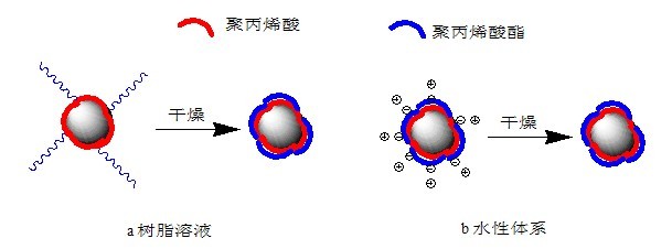 HT A20分子中的錨固部分由(甲基)丙烯酸、磷酸的均聚物或共聚物組成,通過和鈦白粉間的吸引力(配位作用、共價(jià)鍵)吸附在粒子表面,將粒子隔離開來。和樹脂相容的穩(wěn)定部分由丙烯酸酯、甲氧基聚丙二醇丙烯酸酯無規(guī)共聚物組成,賦予表面改性后的鈦白粉粒子良好的再分散性,并且能穩(wěn)定均勻分散在樹脂溶液和溶劑揮發(fā)后的樹脂中。在體系干燥過程中以及干燥后,和樹脂相容的部分能包覆在鈦白粉粒子表面,防止粒子聚集,使得鈦白粉粒子在樹脂中能均勻分散。圖2表示改性劑HT A20處理鈦白粉粒子后,HT A20在粒子表面的形態(tài)。圖2a表示在樹脂溶液或溶劑中,干燥前,改性劑的錨固部分和鈦白粉粒子間通過共價(jià)鍵、配位鍵結(jié)合在粒子表面上,聚丙烯酸酯部分充分伸展,通過空間位阻作用穩(wěn)定粒子;干燥后,聚丙烯酸酯部分包覆在粒子上或和樹脂基體互相滲透。圖2b表示在水性體系中,干燥前,改性劑的聚丙烯酸錨固部分和鈦白粉粒子間通過共價(jià)鍵、配位鍵結(jié)合在粒子表面上,依靠靜電斥力穩(wěn)定粒子;干燥后,聚丙烯酸酯部分包覆在粒子上或和樹脂互相滲透??梢姡p親型嵌段聚合物改性劑HT A20對(duì)鈦白粉進(jìn)行有機(jī)表面處理后,在有機(jī)溶劑體系和水性體系中,都能提高鈦白粉在介質(zhì)中的分散穩(wěn)定性并改善鈦白粉和樹脂的相容性。